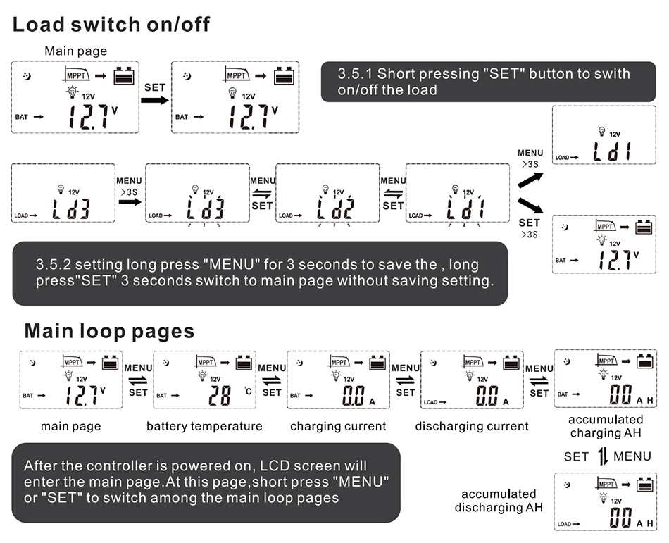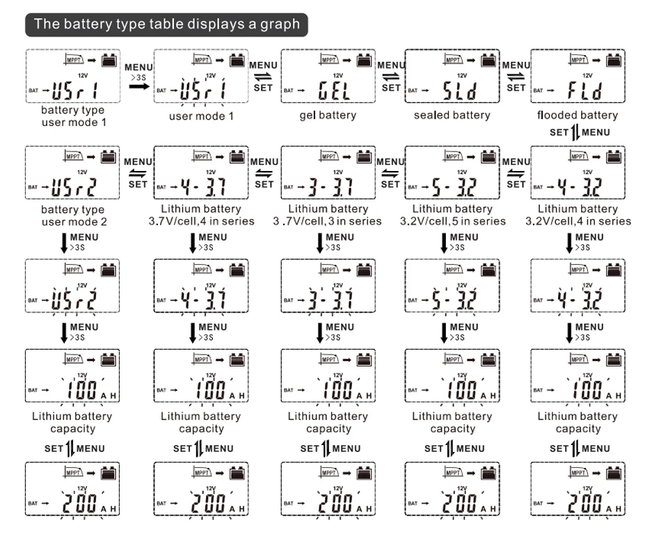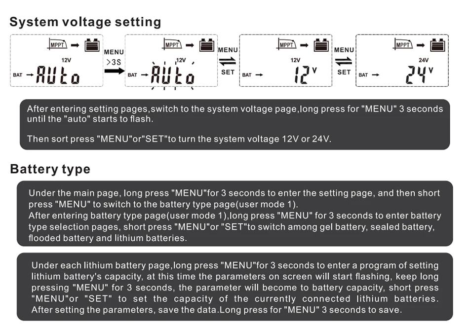 Battery type | User default, Sealed, Flooded, GEL, LiFePO4, Li(NiCoMn)O2. | |||