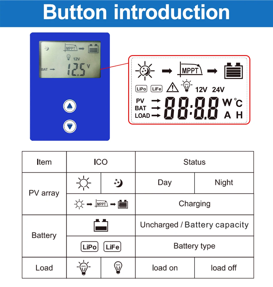 4.Protection: PV array short circuit ,PV reverse polarity , Battery reverse polarity ,Over charging , Output short circuit