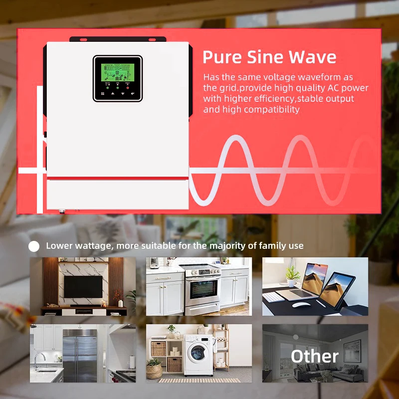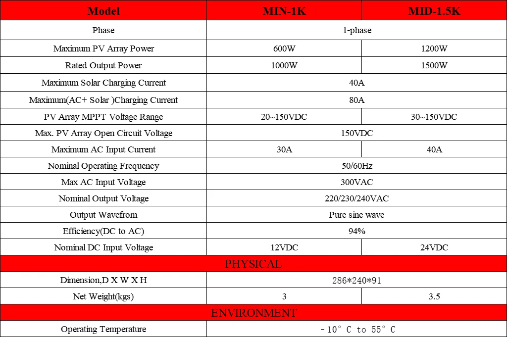 This is a multi-function inverter/charger, combining functions of inverter, solar charger and battery charger tooffer uninterruptible power support with portable size. Its comprehensive LCD display offers user-configurableand easy-accessible button operation such as battery charging current,AC/solar charger priority, andacceptable input voltage based on different applications.