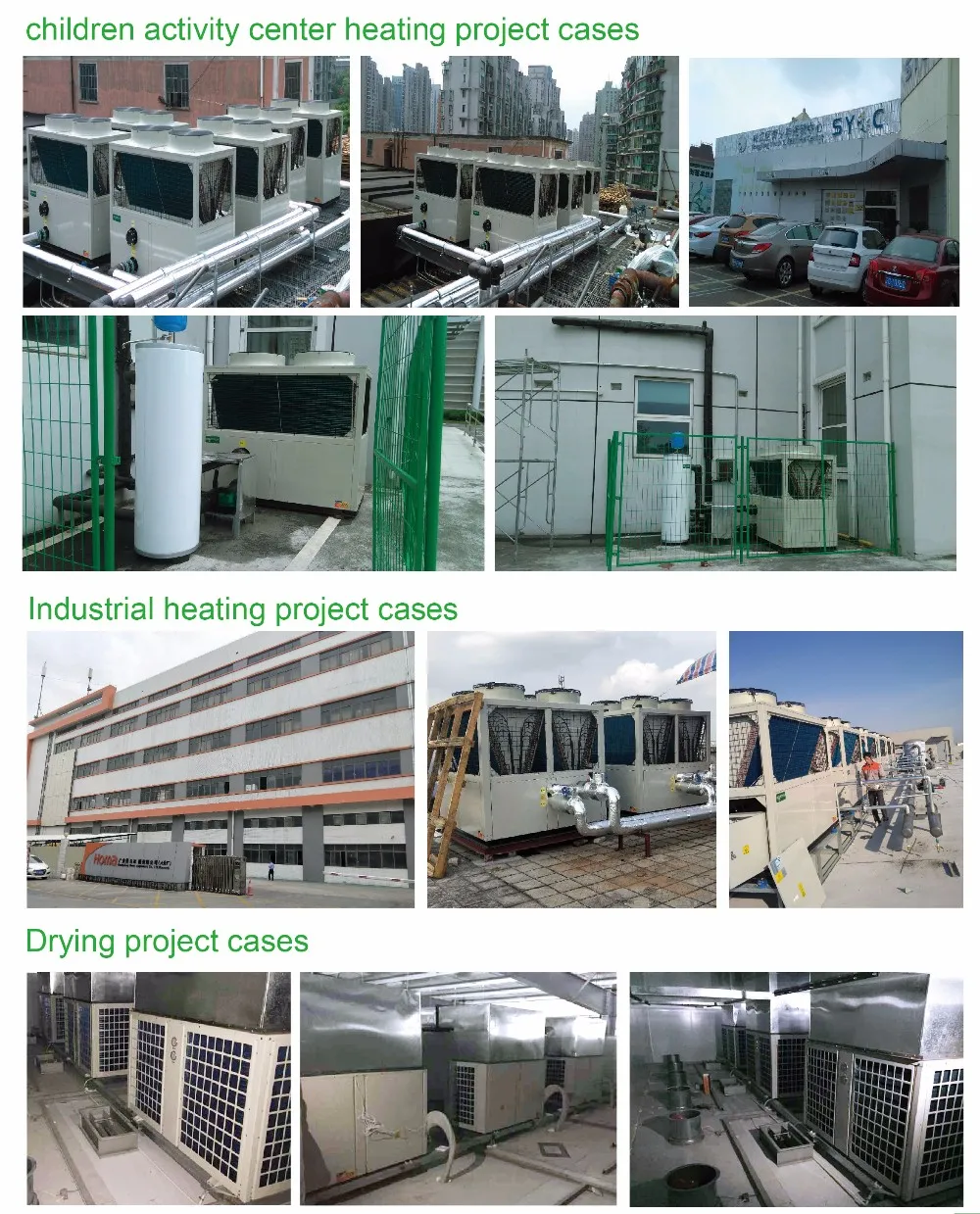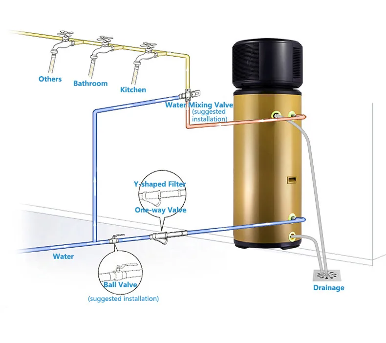1.Compact design Units are especially designed for offering sanitary hot water for family use. Its extremely compact structure and elegant design are suitable for indoor installation. 2.Ecological and Economical Heating Units are the most efficient and economical alternative to both fossil fuel boilers and heating systems. By making use of the renewable source in the air, it consumes much less energy without direct CO2 emission. 3. Multiple Functions The special design of the air inlet and outlet makes the unit suitable for various ways of connections.With different ways of installation, the unit can work as just a heat pump but also as a fresh air blower, a dehumidifier, or an energy recovery device. 4.Application: 1. Waste heat recovery and domestic hot water The system can be used to recover high waste heat in areas such as a kitchen, utility room and so on, even under low temperature conditions such as in winter.