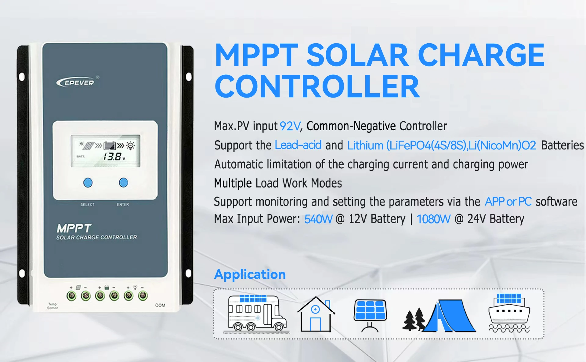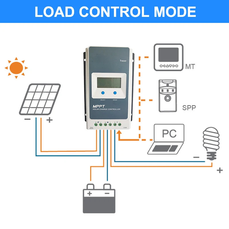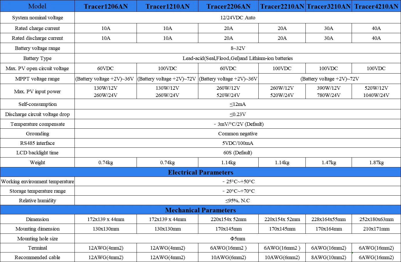 The Tracer AN series. Based on common negative design and advanced MPPT control algorithm, with LCD displaying running status, this product is artistic, economical and practical. Improving the MPPT control algorithm further, Tracer AN series can minimize the maximum power point loss rate and loss time, quickly track the maximum power point of the PV array and obtain the maximum energy from solar modules under any conditions; and can increase the ratio of energy utilization in the solar system by 10%-30% compared with a PWM charging method. The limitation function of the charging power and current and reducingcharging power function automatic improve the stability which works even connecting oversize PV modules and in high temperature, and increase the professional protection chip for the communication port, further improving the reliability and meeting the different application requirements.