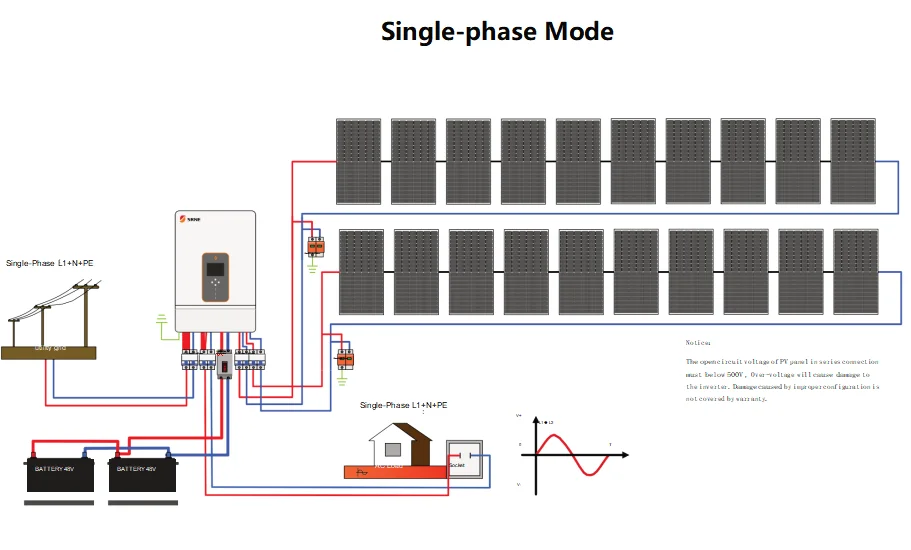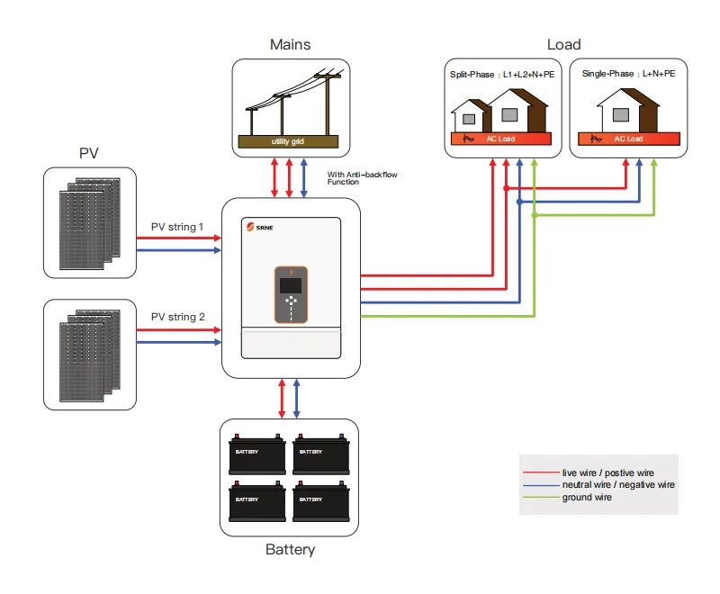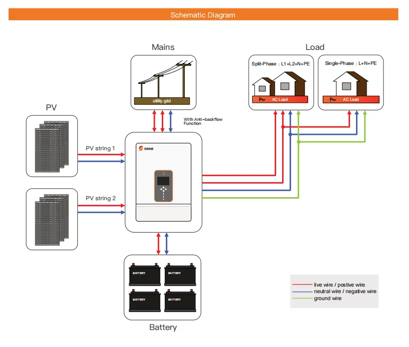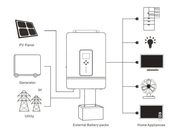 The diagram below shows the system application scenario of this product. A complete system consists of the following components: 1.PV modules: converts light energy into DC energy, which can be used to charge the battery via an inverter or directly inverted into AC power to supply the load. 2.Utility grid or generator: connected to the AC input, it can supply the load and charge the battery at the same time. The system can also operate generally without the mains or generator when the battery and the PV module power the load. 3.Battery: The role of the battery is to ensure the regular power supply of the system load when the solar energy is insufficient and there is no mains power. 4.Home load: Various household and office loads can be connected, including refrigerators, lamps, televisions, fans, air conditioners, and other AC loads. 5.Inverter: The energy conversion device of the whole system. The actual application scenario determines the specific system wiring method.