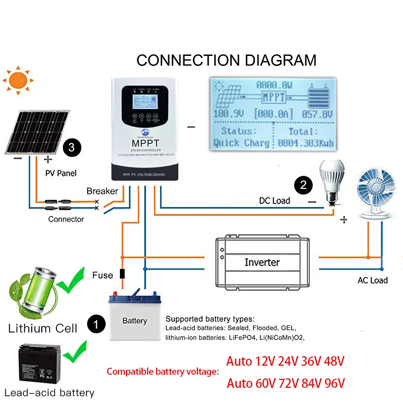 charging mode | MPPT tracks maximum power, fast charging, | ||||||
