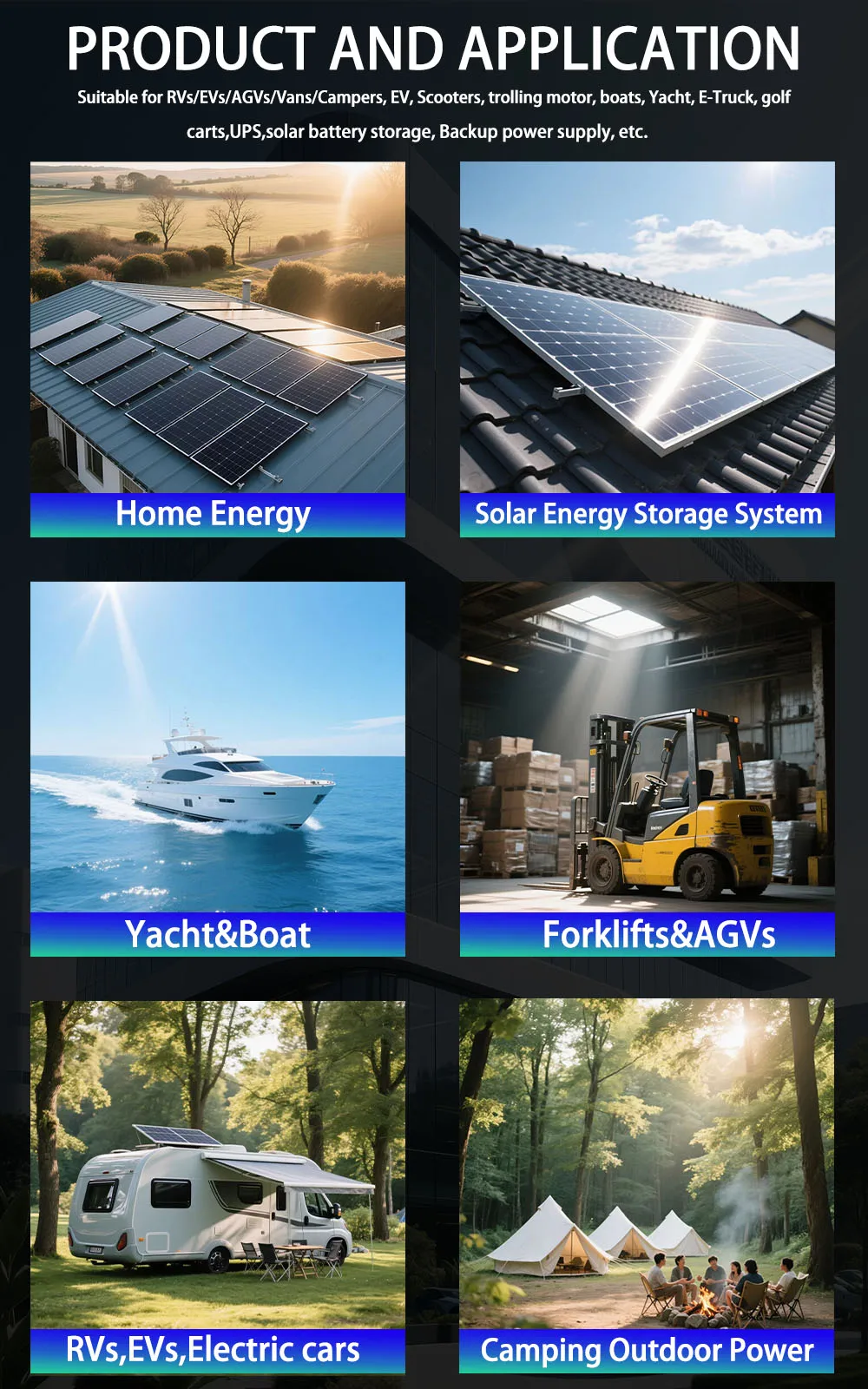 Electric vehicles, golf carts, yachts, solar and wind energy systems, electric tools and mobile devices, backup power sources, RVs, UPS power sources, ship energy storage, communication energy storage, and electrical energy storage…