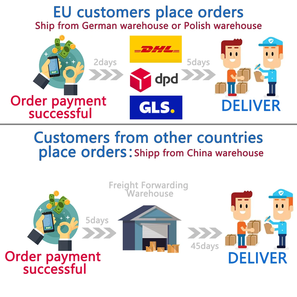 1. For orders starting from April 2025, for customers in EU countries, the batteries will be shipped from the German or Polish warehouse by default, with an estimated delivery time of 5 to 7 days; if the warehouse is out of stock, we will send a message to inform the customer and ship the batteries from the Chinese warehouse, with an estimated delivery time of 50 to 60 days.