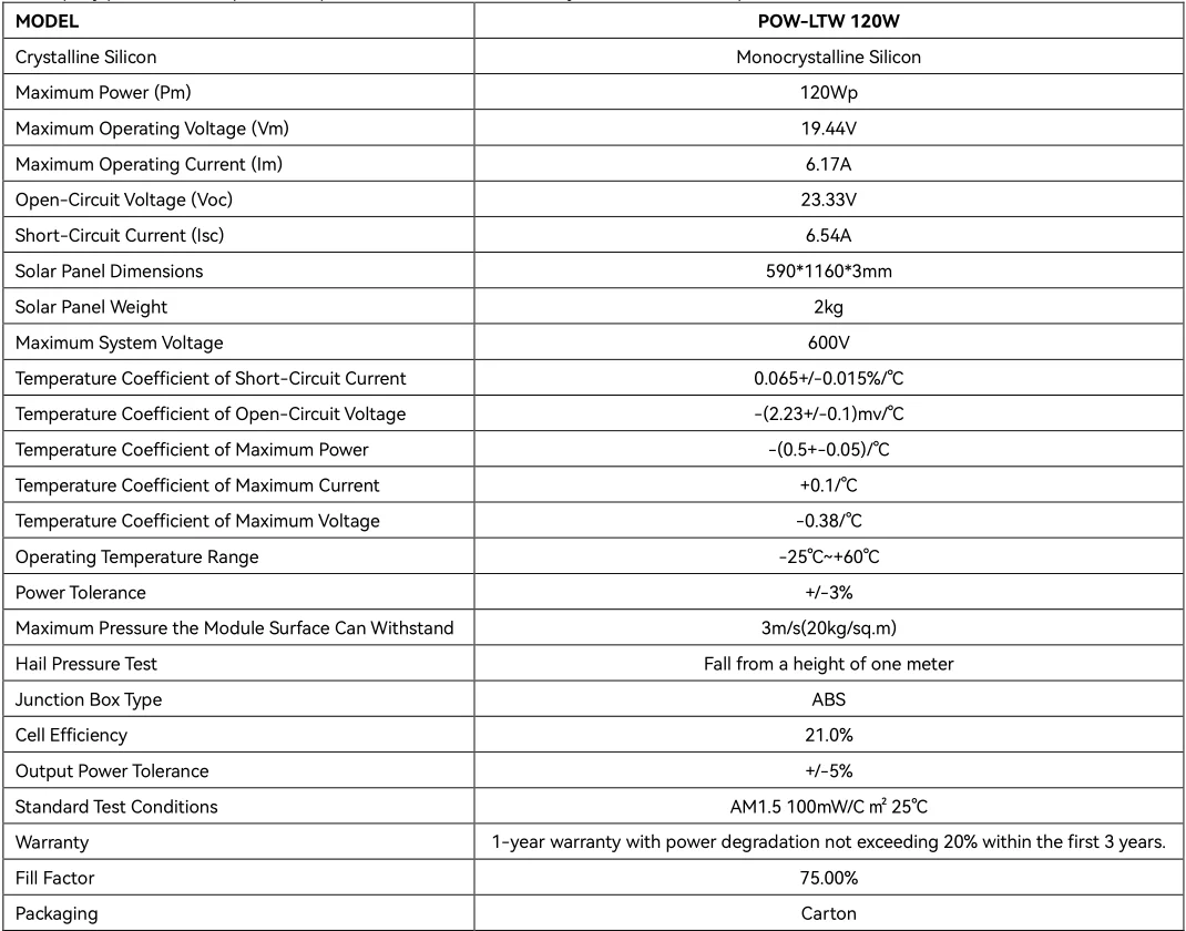 A single solar module weighs only 3.2 kilograms, which is more than 70% lighter than traditional solar modules. It measures approximately 1160x590mm and is only 2mm thick, making it easy to transport, install, hang and disassemble.