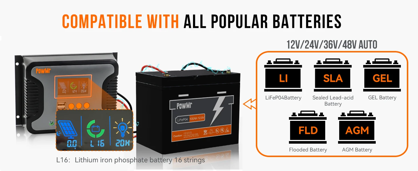 【COMPATIBLE BATTERY TYPE】solar controller 60 amp compatible with various 12V/24V/36V/48v lithium-ion and lead-acid batteries, such as SEL, USE, FLD, GEL, LiFePO4, and ternary lithium batteries; type; support user-defined batteries and easy select battery, and can calibrate battery voltage.