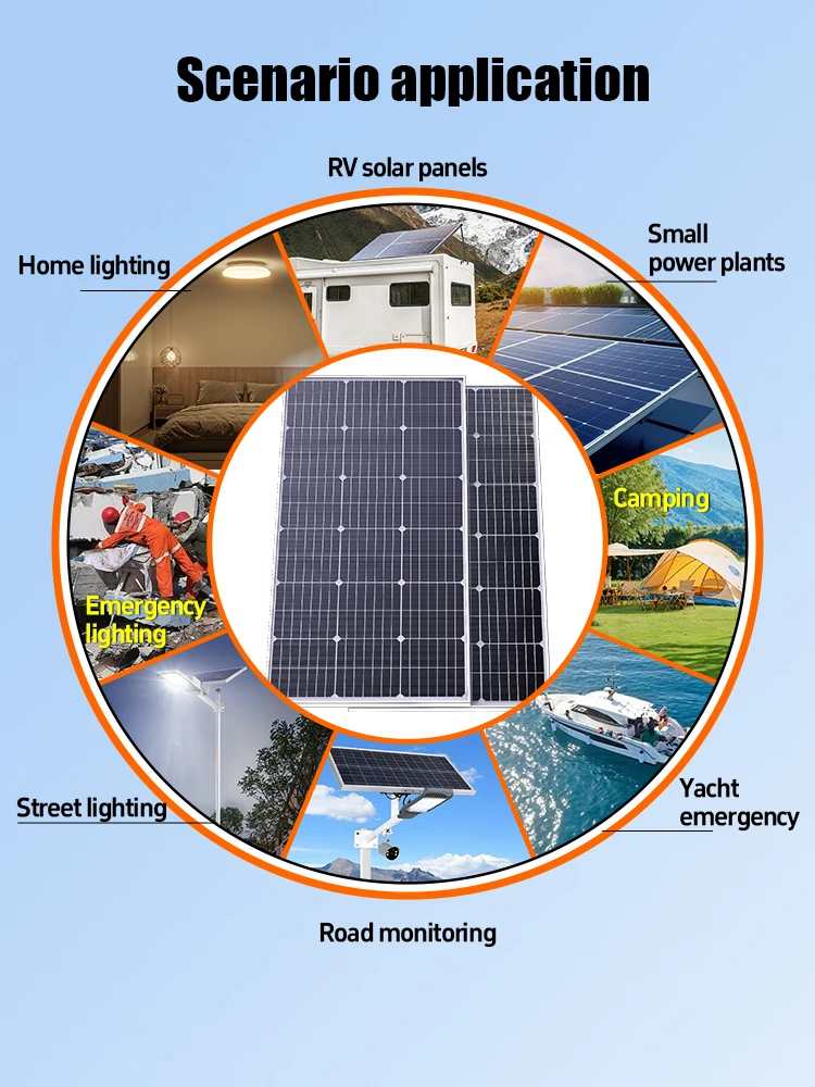 Widely used: Under 4 hours of full sunlight, the daily production capacity is 400wh/day. It is very suitable for RVs, caravans, oceans, camping vehicles, electric scooters, golf carts, power wheels, fishing motors, tool trailers, and backup power sources for small sheds.