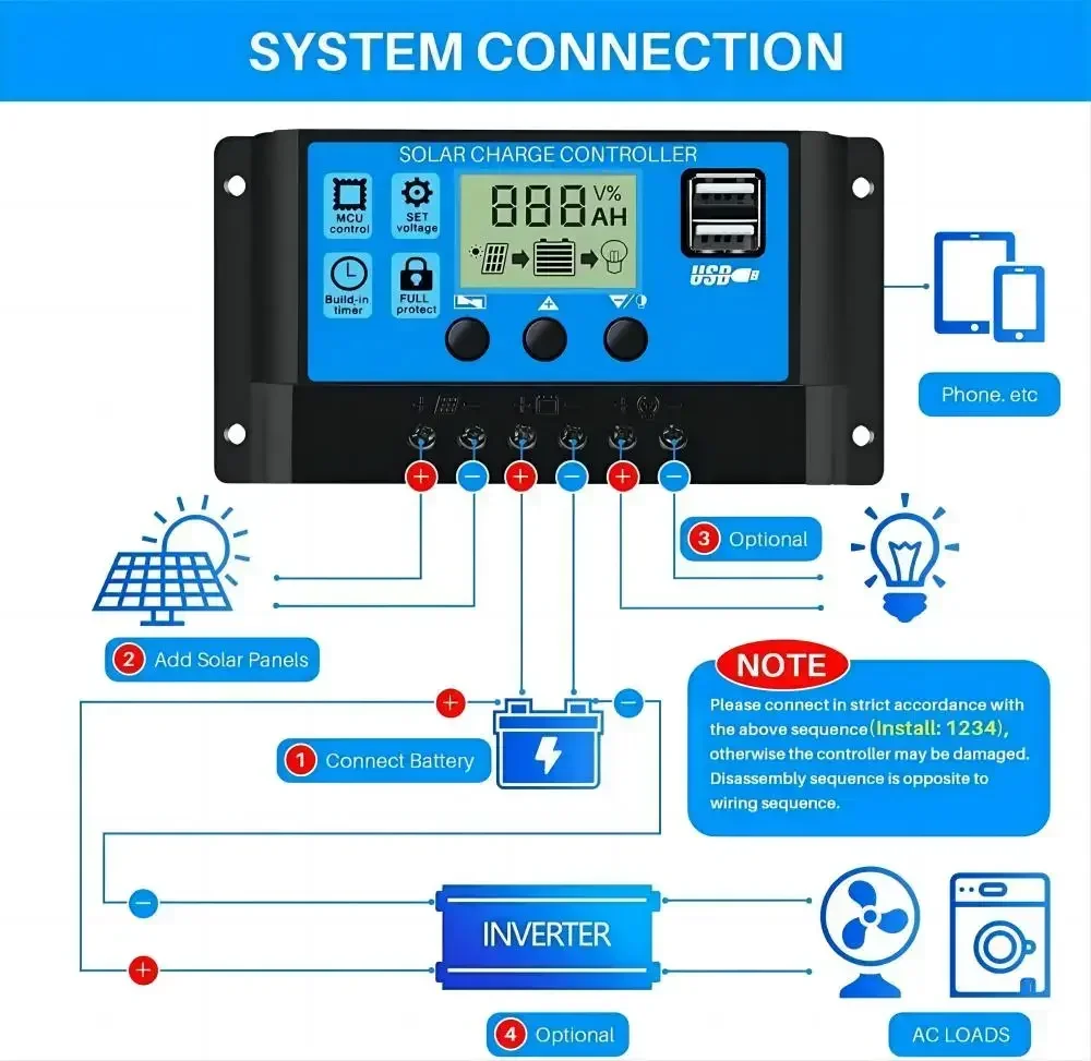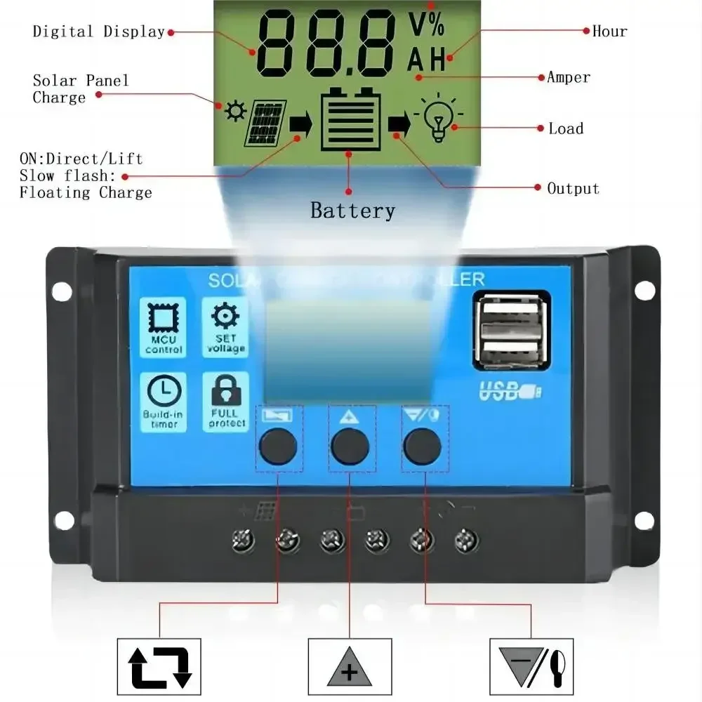 Note : This controller is only suitable for various lead-acid batteries (including openings, seals, gels, etc.), please do not use it to charge other batteries (including lithium batteries, nickel-metal hydride batteries, etc.)