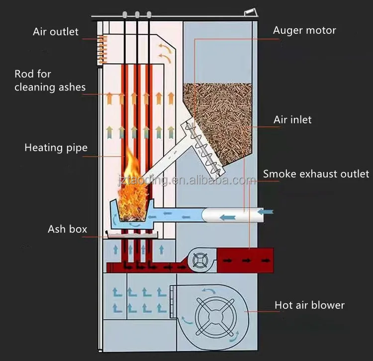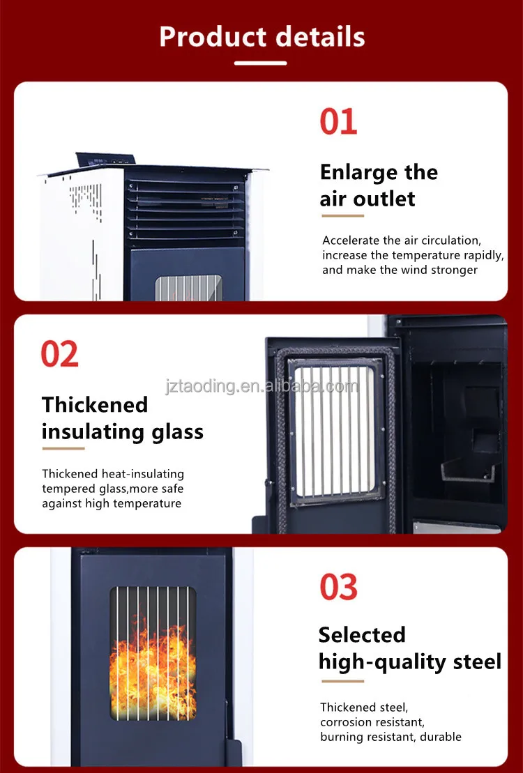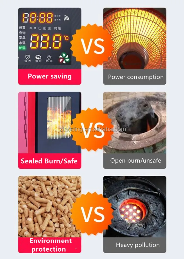 1. Intelligent control system Automatic ignition and automatic feeding when the machine is turned on, no need for special personnel to take care of it, you can adjust your ideal temperature at will, you can set the ignition and extinguishing time, andone feeding can be used for 6-8 hours of continuous heating.