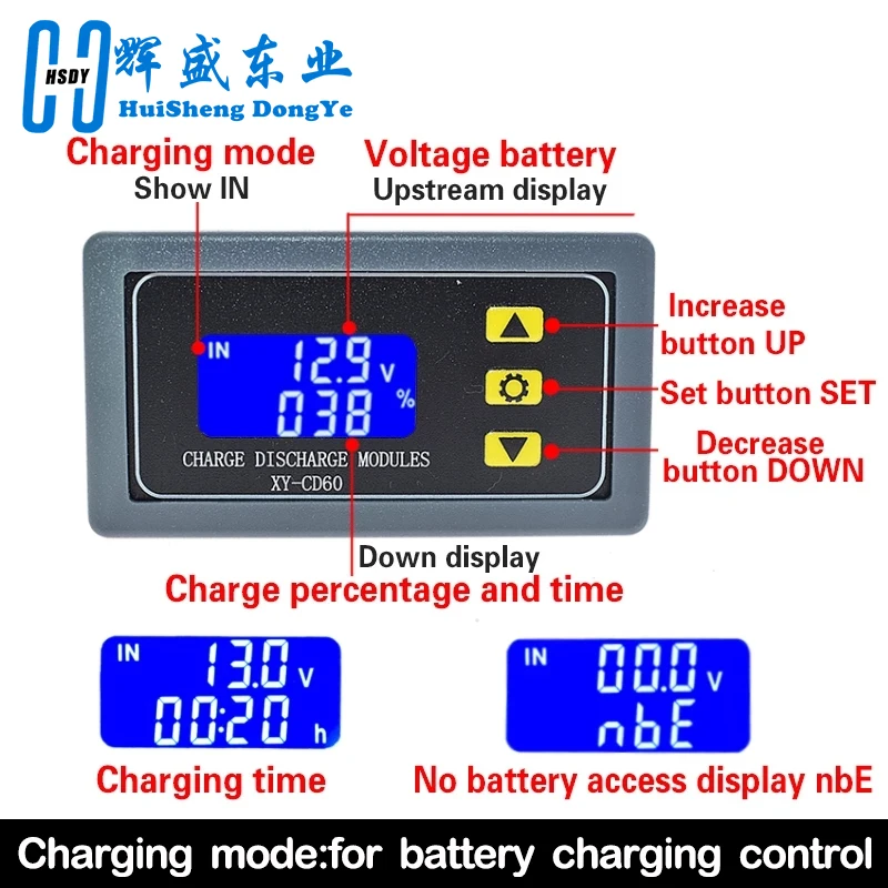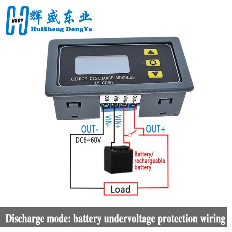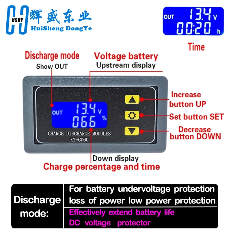 By setting the upper limit voltage UP and the lower limit voltage dn; when the battery voltage is greater than or equal to the upper limit voltage UP, the relay turns on and starts discharging; when the battery voltage is less than or equal to the lower limit voltage dn, the relay turns off and completes an automatic discharging function; when the relay turns on, the OUT flickers, indicating that it is discharging.